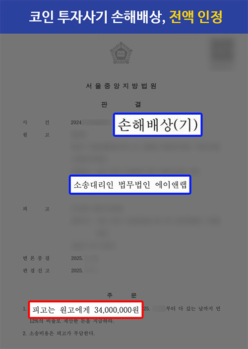 그 결과, 사건을 담당한 서울중앙지방법원에서는 이러한 조건명 변호사의 주장을 인정하여 의뢰인이 청구한 손해배상금 1억 원 전액을 지급하라는 판결을 내려주었습니다.
