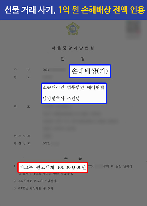 현물 옵션 선물 투자에 참여하도록 유도받은 의뢰인이 가짜 거래 플랫폼을 통해 사기를 당한 사건에서, 불법행위자와 공모자에 대한 민사 책임을 주장하여 손해배상금 1억 원 전액 인용 판결을 이끌어낸 사례.