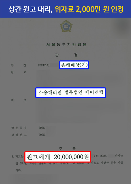 그 결과 사건을 담당한 서울동부지방법원에서는 이러한 박현식 변호사의 주장을 인정하여 2,000만 원의 손해배상금을 지급하라는 판결을 내려주었습니다.