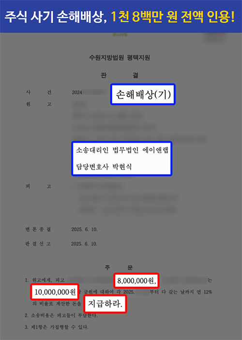 그 결과 사건을 담당한 수원지방법원에서는 이러한 박현식 변호사의 주장을 인정하여 청구한 손해배상금 1,800만 원 전액을 지급하라는 판결을 내려주었습니다.