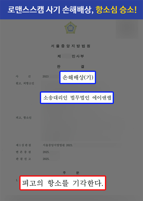 로맨스 스캠 피해로 인해 손해배상 청구 소송을 제기한 의뢰인이 1심에서 전액 인용 판결을 받은 데 이어, 상대방의 항소에 맞서 항소심에서도 승소한 사례.