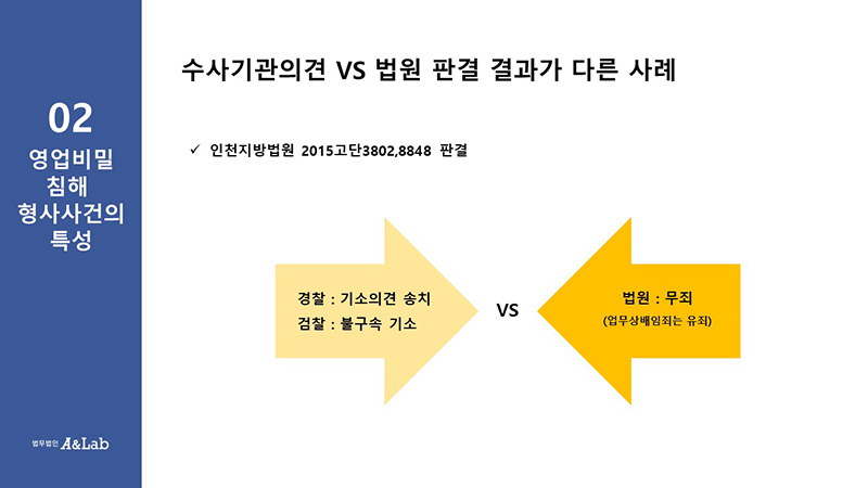 특히 수사기관의 의견과 법원의 판결 결과가 다른 사례들을 들어 영업비밀 침해 사건 발생 시 수사단계에서부터 주의해야 할 사항들이 무엇인지 조언하였습니다.