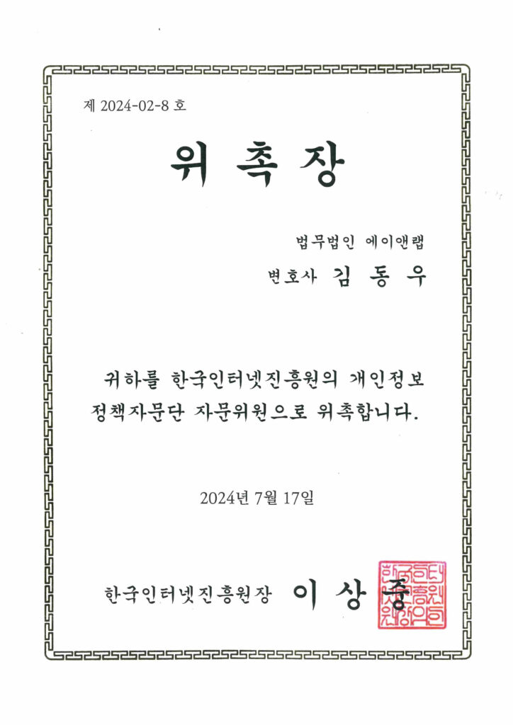 김동우 변호사는 2024년 7월 17일 한국인터넷진흥원(KISA) 「개인정보 정책자문단 자문위원」으로 위촉되었습니다.