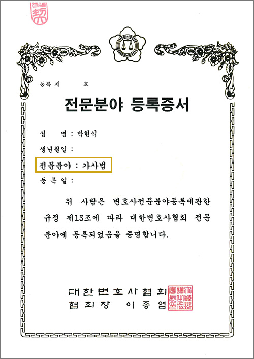 법무법인 에이앤랩 박현식변호사는 변호사 전문분야 등록에 관한 규정 제13조에 따라 대한변호사협회에 가사법 전문변호사 등록을 마쳤습니다.