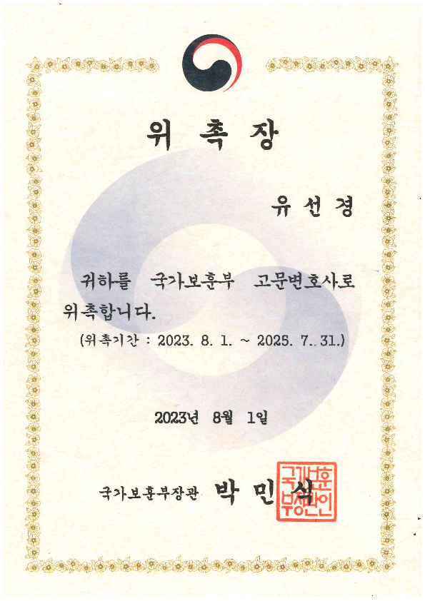 법무법인 에이앤랩 유선경 변호사는 2023년 8월 국가보훈부 고문변호사로 위촉되었습니다.